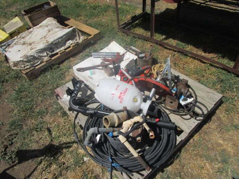 LOT 546 - PALLET HOME LIGHT CHAIN SAW, GREASER, PIPE WRENCH TOOLS, MALLS, PIPE FITTING ETC