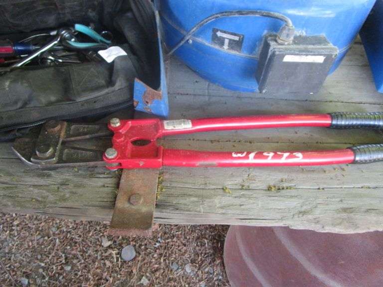 LOT 973 - ELEC BLUE FAN, BAG MISC TOOLS, TOOL BOX W/CONTENTS, BOLT CUTTER 4PC